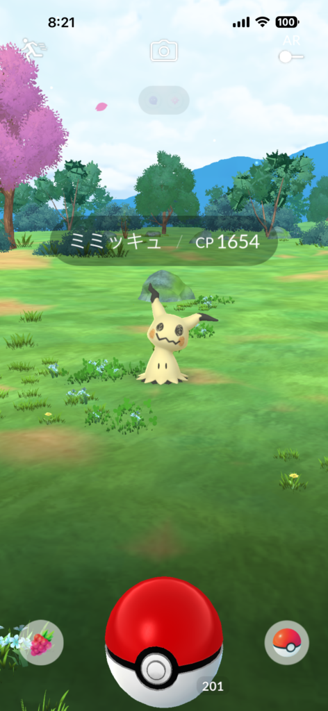 夜中にポケモンGOをたまたま開いた自分は右下のポケモンの影に驚き!なになに???と固まってしまいました・・・そんな時「ミミッキュ」の方から会いに来てくれました。なかなかのサプライズでしたね!